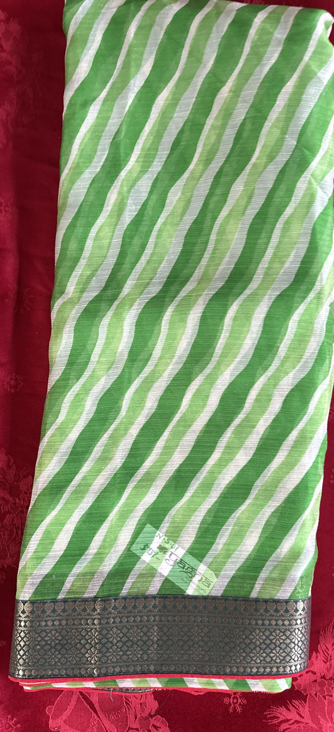 Parrot green chiffon saree with zari border and blouse piece attached