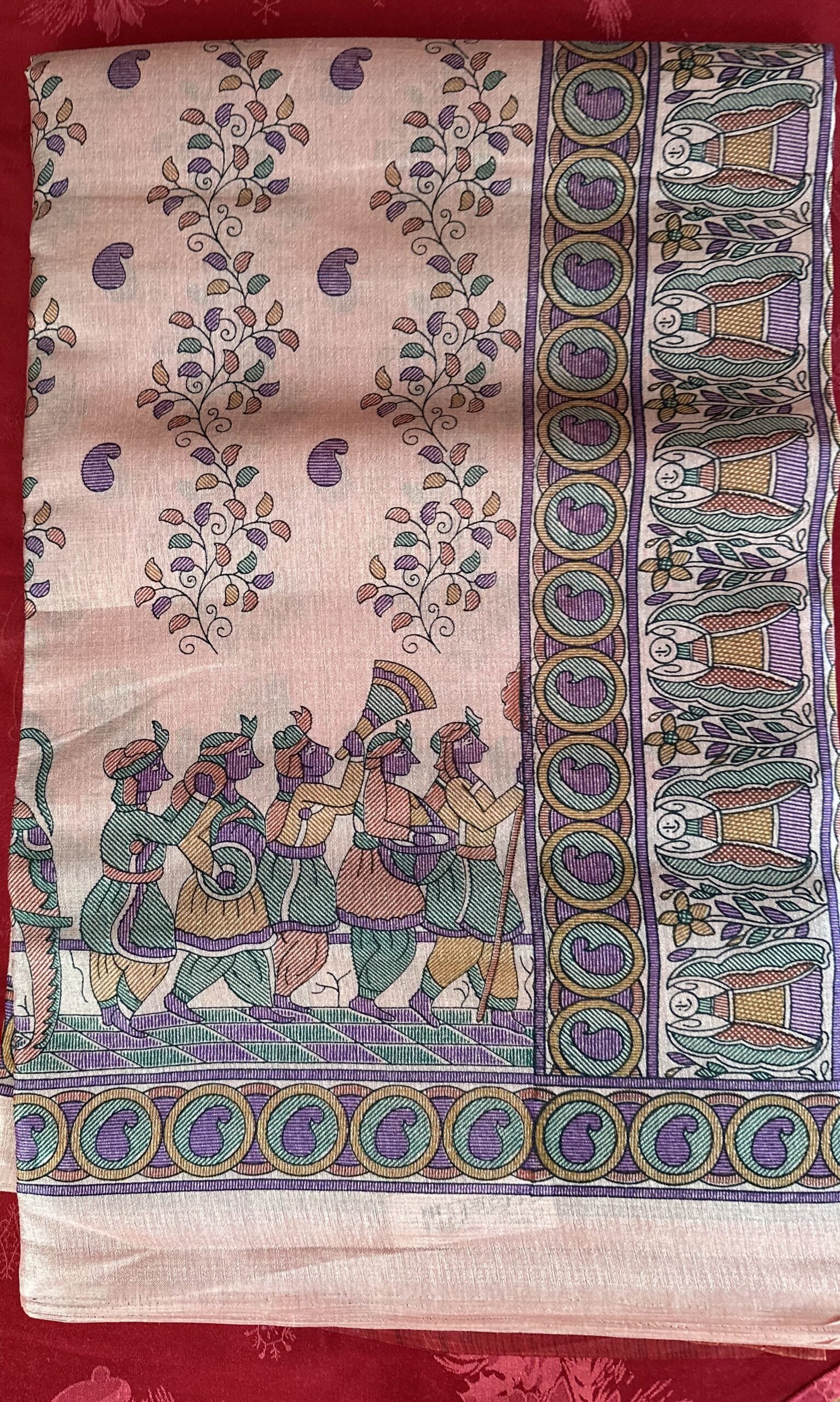 Light orange madhubani prints with a beautiful pallu and a plain blouse piece attached.